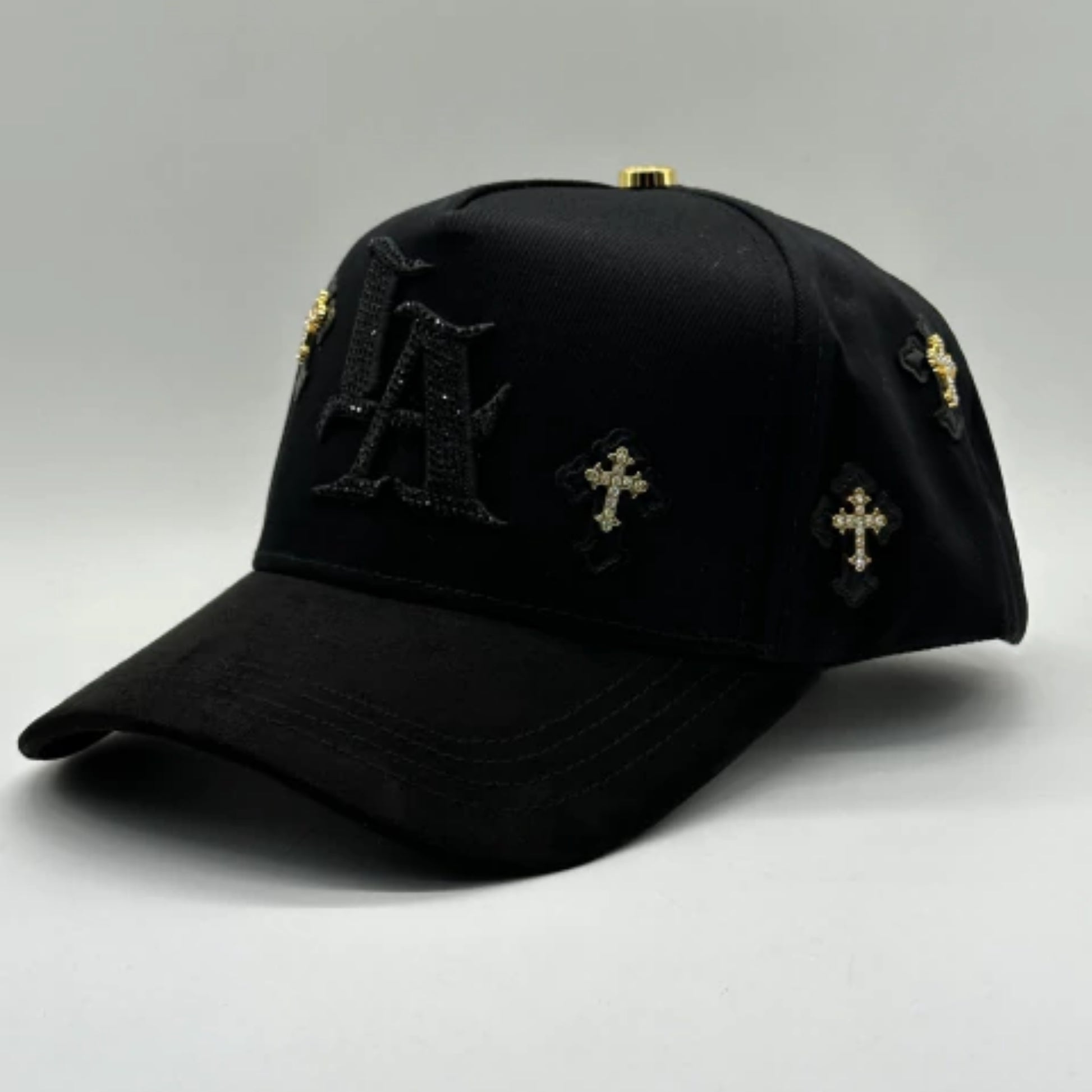 Gorra tipo baseball en color negro, diseñada con un estilo elegante y dominante. En el panel frontal resalta una letra “LA” bordada en negro, integrada de forma sutil al diseño, acompañada por cruces doradas con aplicación tipo cristal, que aportan brillo, contraste y un acabado premium.