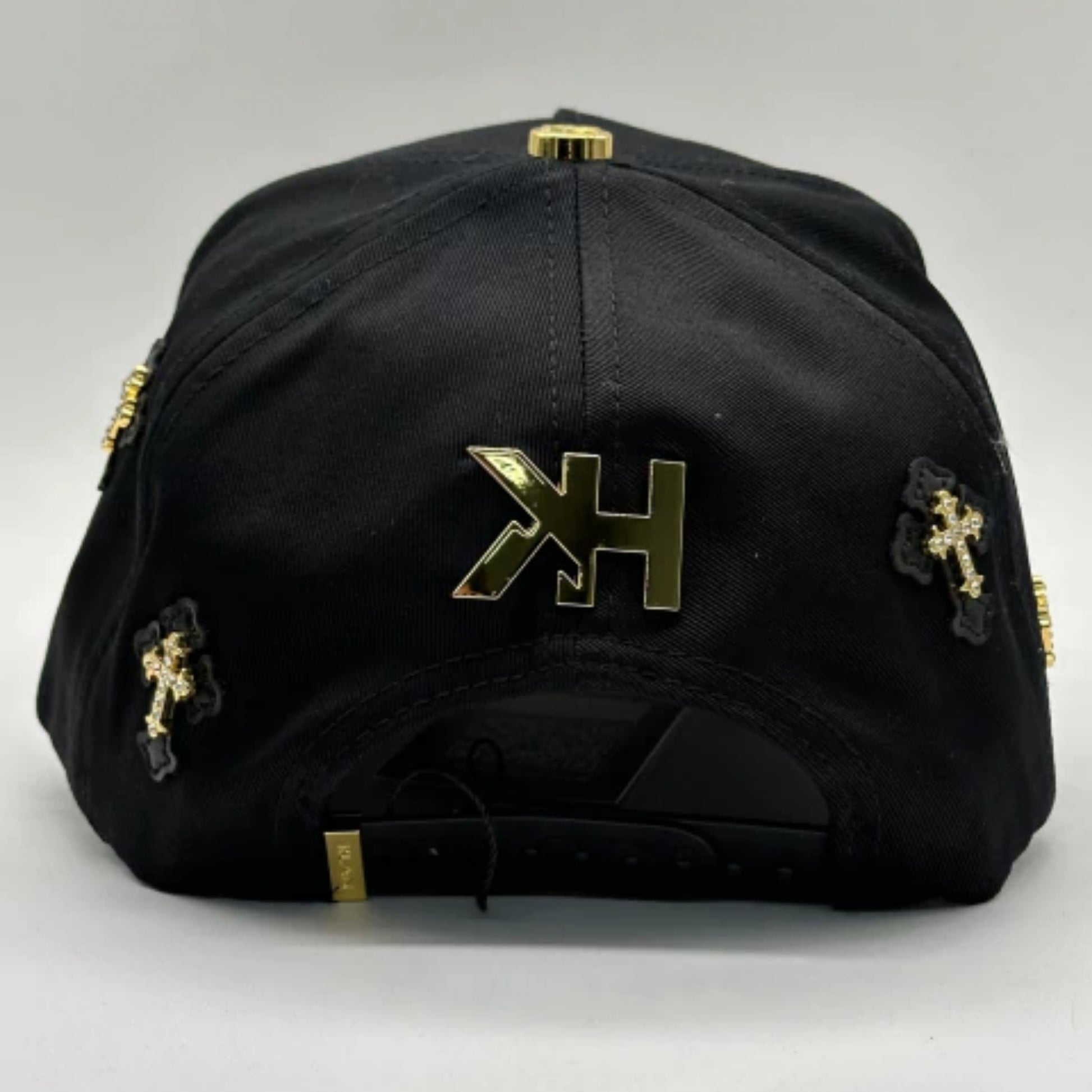 Las cruces están distribuidas de manera equilibrada en el frente, convirtiéndose en el elemento visual principal y reforzando el carácter simbólico y exclusivo del modelo. La visera curva negra mantiene una línea limpia y estructurada, con costuras visibles que refuerzan su calidad. Incluye etiqueta distintiva en la parte inferior frontal como sello de autenticidad.