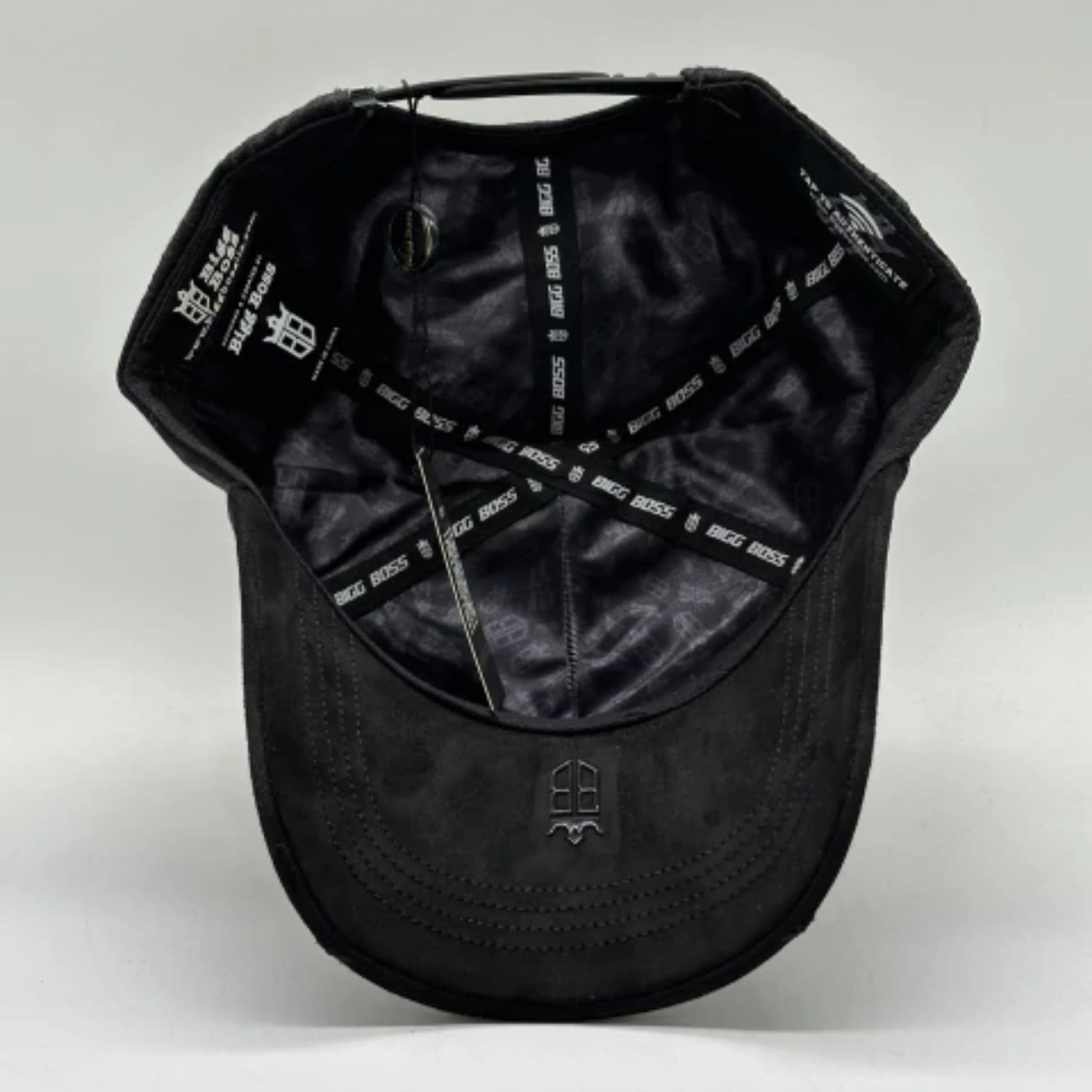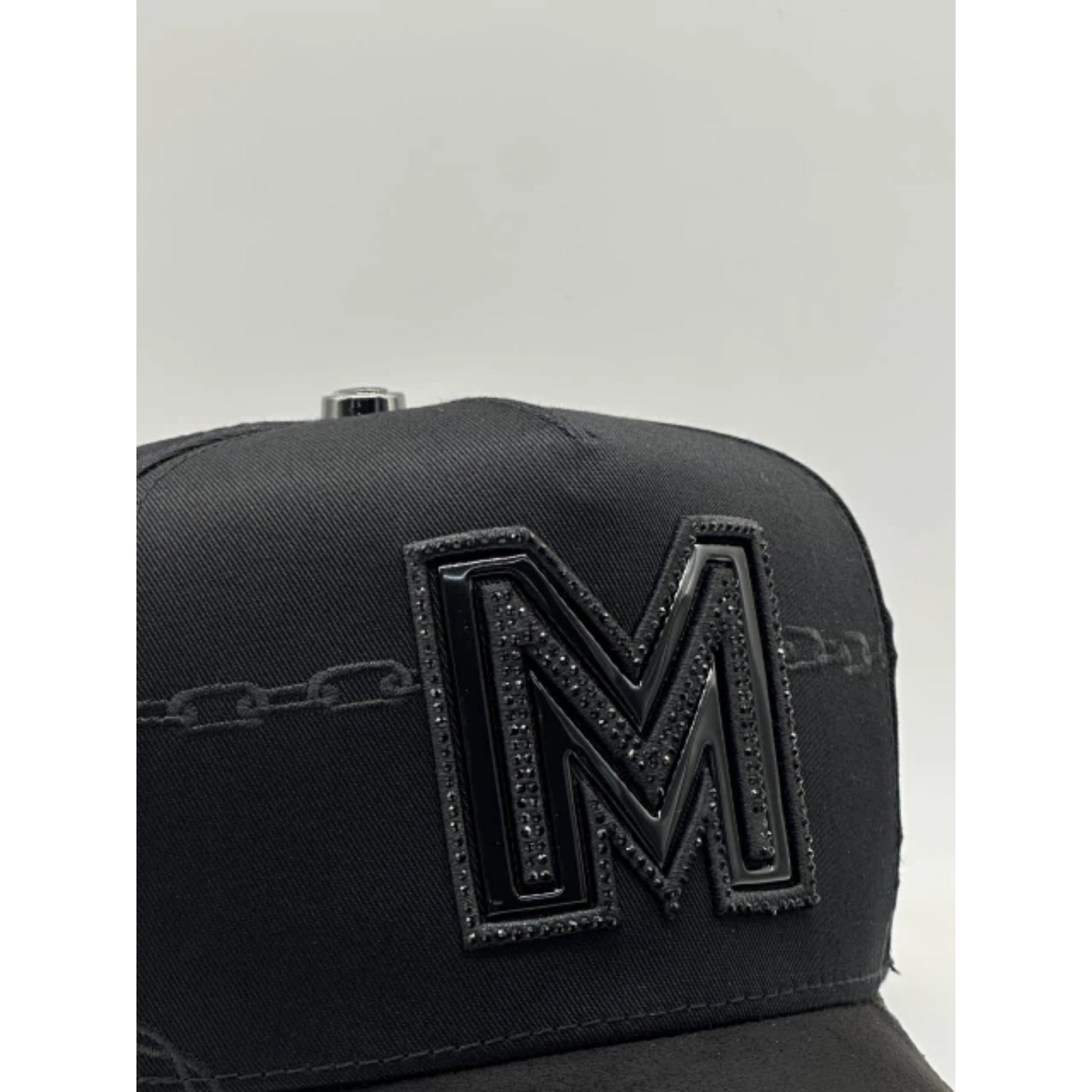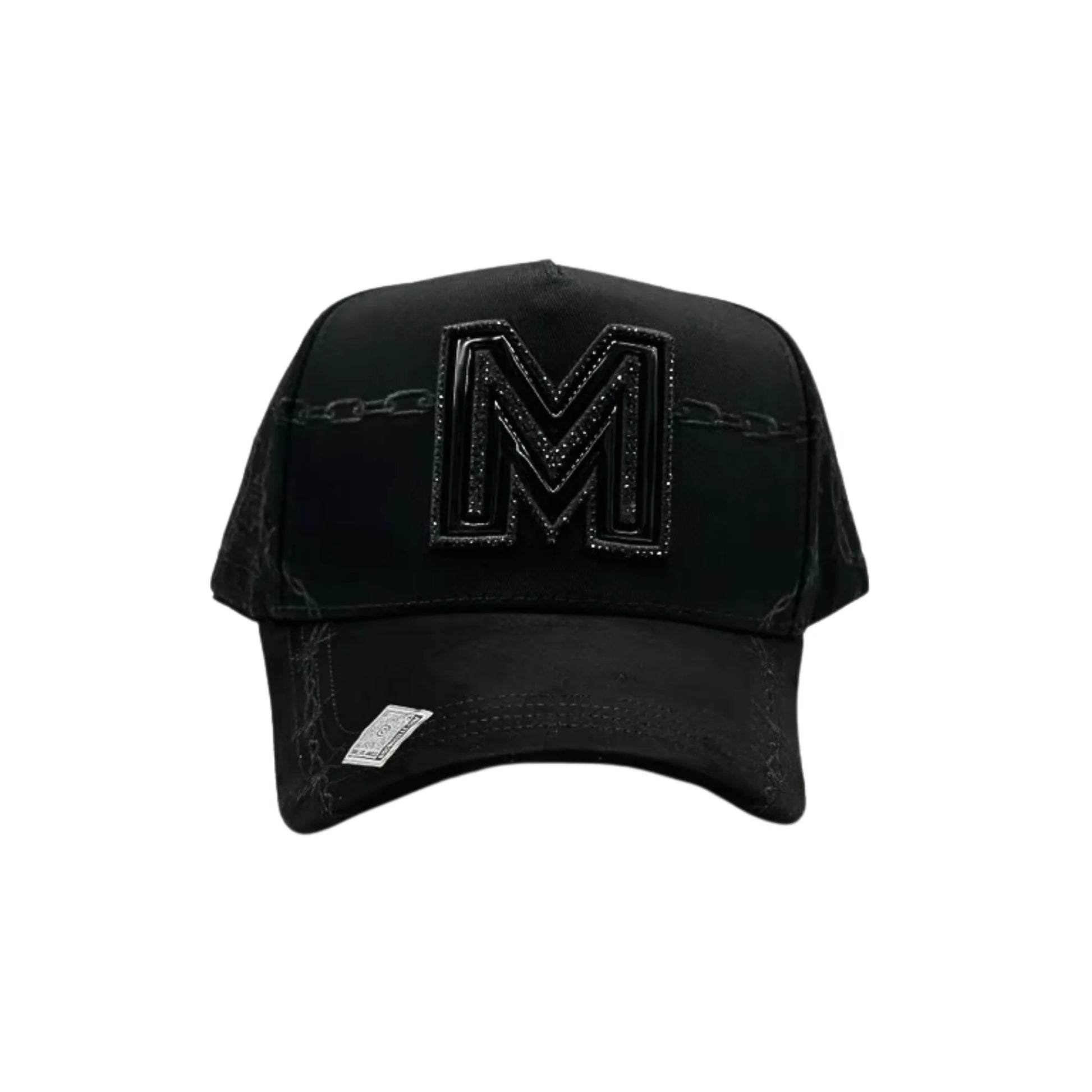 La gorra BIG BOSS // MEXICO NEGRO es un accesorio de moda urbana tipo snapback ajustable, caracterizada por su diseño totalmente negro y un logotipo prominente de la letra "M" bordado en alto relieve en el panel frontal, también en tono negro, lo que le otorga un estilo monocromático y discreto. Esta gorra, parte de la línea "México" de la marca Big Boss, se distingue por detalles de lujo sutiles, como texturas de cadenas grabadas en la tela de los paneles laterales y frontales, y cristales o diamantes incrustados que delinean el borde del logotipo "M". Está fabricada con materiales de alta calidad y se vende como un producto 100% original, nuevo y con sus etiquetas de autenticidad.