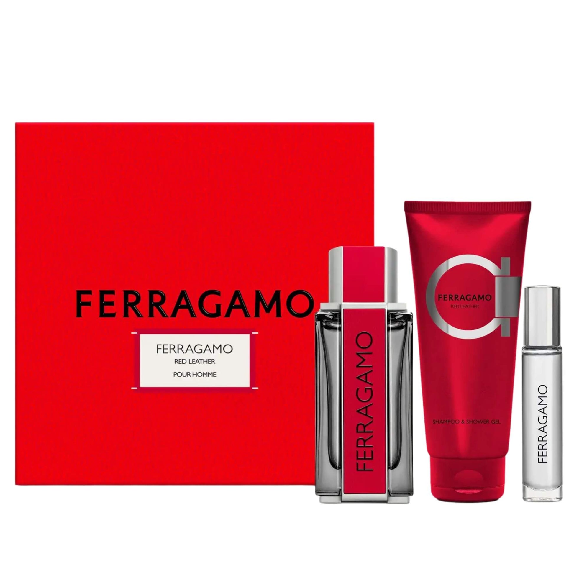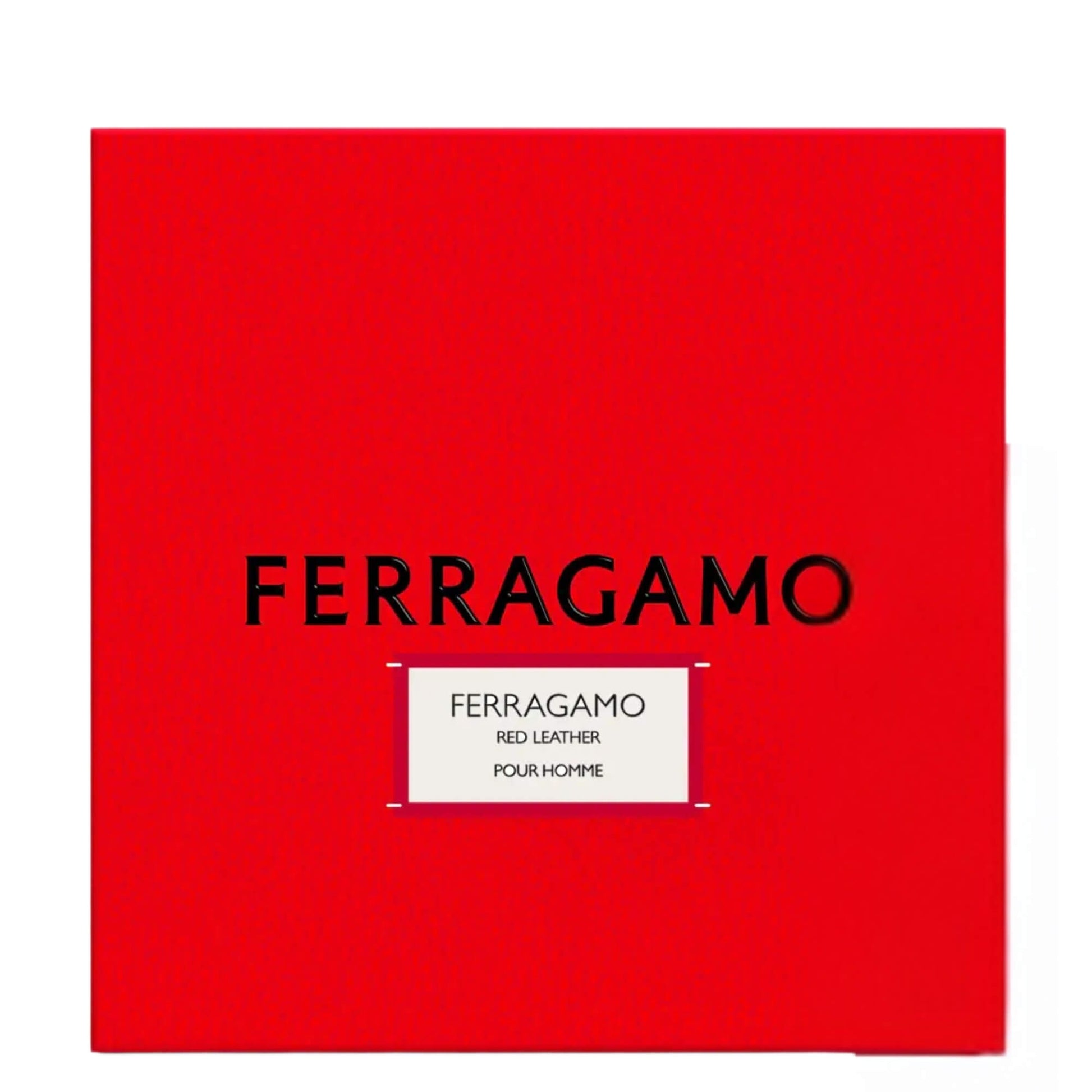 Set 3 Piezas Ferragamo Red Leather Pour Homme – Un set sofisticado y vibrante que captura la fuerza y el carácter de la masculinidad moderna, con un toque cálido y especiado.